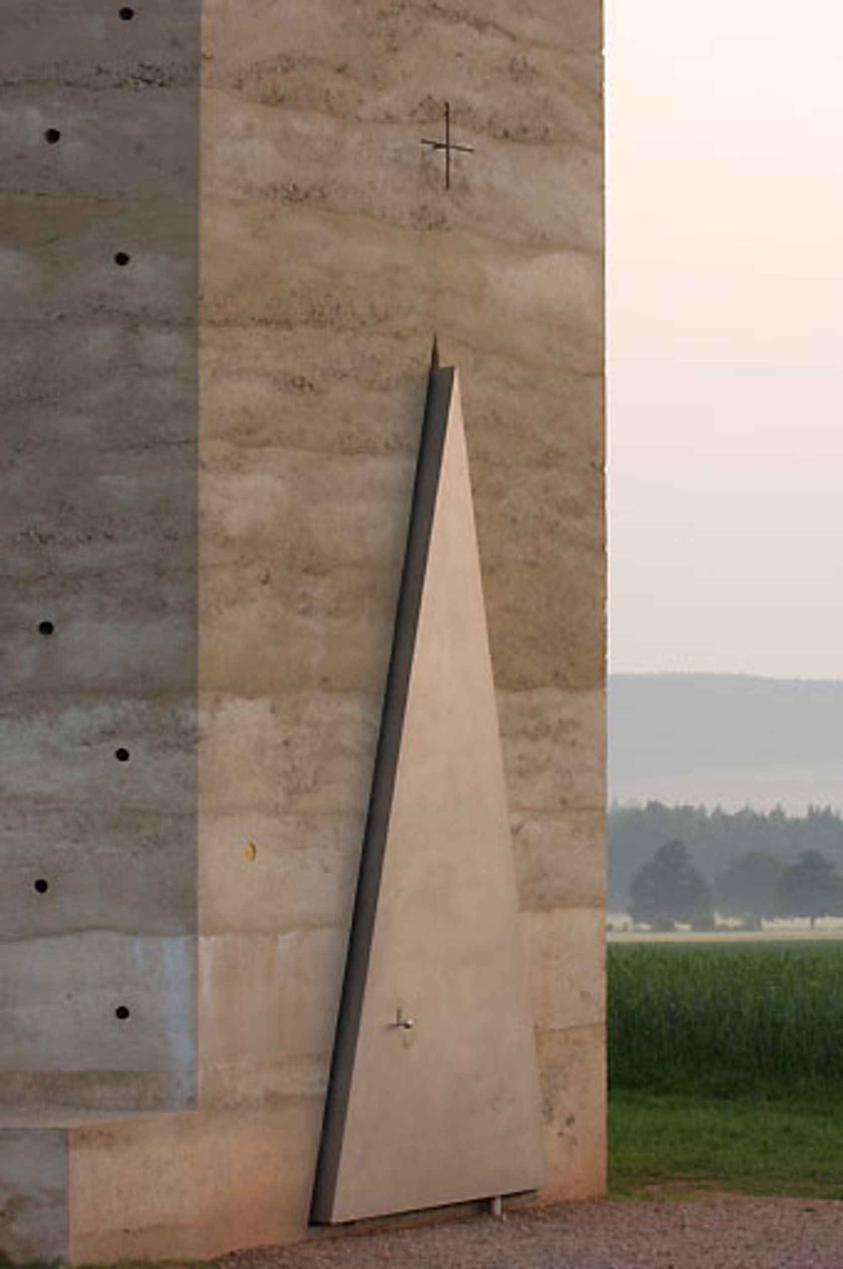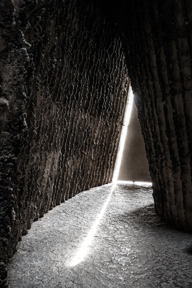 Chapel has another interesting feature. No electric or plumbing lines can be seen. The only means of lighting is through the triangular door and the open sky top of the conical walls. Breaking the monotony and provoking one’s senses to remember the space is his uniqueness.